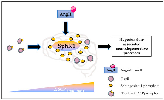 Central illustration. AngII stimulates an SphK1-mediated elevation of brain S1P concentrations, which establishes an S1P gradient between the brain and the circulating blood that allows S1P-governed T cell infiltration to the brain. AngII—angiotensin II, S1P—sphingosine-1-phosphate, S1P1—S1P receptor type 1.