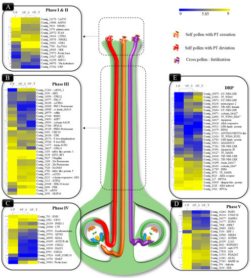 2.4. Phase Specific Differentially Expressed Transcripts Involved in Pollen-Pistil Interaction