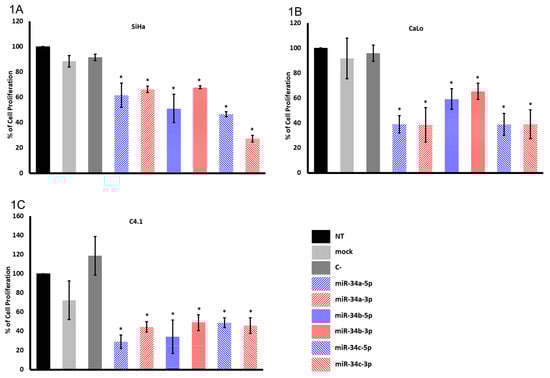 SiHa, CaLo, and C4.1 cells transfected with pre-miR-34a-5p, pre-miR-34a-3p, pre-miR-34b-5p, pre-miR-34b-3p, pre-miR-34c-5p, and pre-miR-34c-3p mimics resulted in a differential and significant decrease in proliferation compared with non-treated (NT), mock, and control (C)-treated cells measured by a reduction in crystal violet signal 72 h post-transfection (p < 0.05). The inhibition was considered specific to miR-34 members because controls did not show a significant reduction in proliferation (Figure 1A).