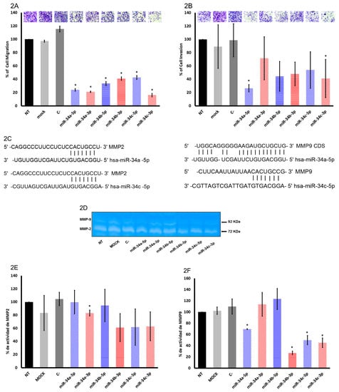 MMP2 and MMP9 are well-recognized markers of invasion [,]; therefore, we analyzed the activity of the two metalloproteases. We searched for binding sites of miR-34 family members in MMP2 and/or MMP9 mRNAs, and we found that miR-34a-5p and miR-34c-5p had binding sites for these genes (Figure 2C). However, miR-34a-5p and miR-34c-5p that have 3’ untranslated region (UTR) binding sites did not show any effects, contrary to the miR-34a-3p mimic that showed a reduction in MMP2 activity despite 3’ UTR binding sites being absent (Figure 2D,E). Moreover, miR-34a-5p, miR-34b-5p, miR-34b-3p, miR-34c-5p, and miR-34c-3p overexpression did not present a statistically differential effect in MMP2 activity (Figure 2E). On the other hand, MMP9 activity was diminished by miR-34a-5p, miR-34b-3p, miR-34c-5p, and miR-34c-3p (Figure 2G,H). In accordance with database RNA22-HSA MMP9 is targeted by miR-34a-5p and miR-34c-5p (Figure 2C); interestingly, miR-34b-3p and miR-34c-3p reduced its activity. It is not clear if the 3p strands of miR-34b and c target MMP9 directly or indirectly.
