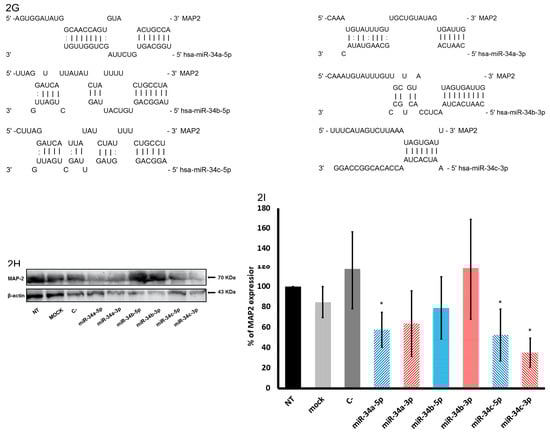 As MAP2 is associated with migration in epithelial cells [], we analyzed the effect of miR-34 family members on its expression. MAP2 has binding sites for all miR-34 family members (Figure 2F), although only miR-34a-5p, miR-34c-5p, and miR-34c-3p downregulated MAP2 in a statistically significant manner (Figure 2G,H). The role of MAP2 in cell migration in cervical cancer is not well understood; however, it could be one of the genes that miR-34 family members regulate to achieve their function in the cells. The down- and/or upregulation of MAP2 observed in this work needs further studies. Migration and invasion are not totally explained by MMP9, MMP2, and MAP2 protein expression inhibition; however, it must be taken into consideration that every strand has several mRNAs targets that could be involved in cellular processes.