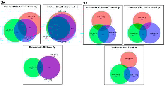 For example, miRDB miR-34a-5p potentially regulates 12 genes individually and miR-34b-5p regulates 316 genes, while miR-34c-5p regulates three individual genes (Table 1). The 5p arms of miR-34a, b, and c regulate 76 genes in common (Figure 3A). Individually, miR-34a-3p potentially regulates 217 genes, miR-34b-3p regulates 250 genes, and miR-34c-3p regulates 128 genes; it could be noted the 3p arms regulate more genes individually (Figure 3B), despite the 5p arms potentially regulating more targets (Table 1). The same pattern was shown in the RNA22-HSA and miRDB databases (Figure 3A,B; Table 1).
