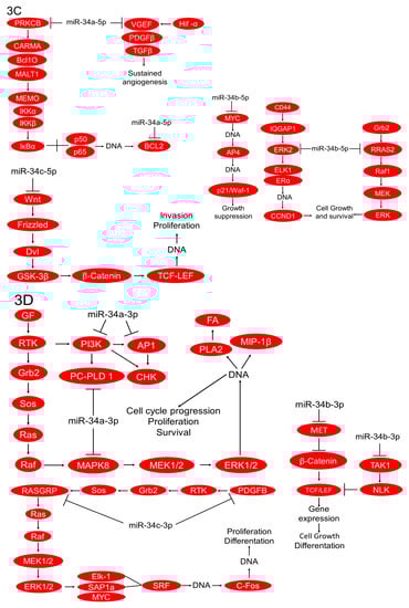 The genes were ranked in the following cell and molecular processes: nuclear factor (NF) κB signaling pathway, galactose metabolism, chemical carcinogenesis, Gonadotropin-Releasing Hormone Receptor (GnRH) signaling pathway, fatty-acid degradation, and gamma-aminobutyric acid (GABA)ergic synapse, among others (Table 2). The cell-signaling pathways were selected based on the exclusivity of each miR-34 family member strand. We grouped cell-signaling pathways that are potentially regulated by 5p and 3p strands of miR-34 family members into six pathways. We found that miR-34a-5p directly induces apoptosis via Blc-2 inhibition and indirectly via downregulation of PRKCB/IkBα (Figure 3C). Bcl-2 and PRKCB appear as validated targets for miR-34a-5p in DIANA, miRanda, miRbridge, Pictar, RNA22HSA, and TargetScan databases, while VGEF was not validated. Furthermore, miR-34b-5p presents a dual effect on growth suppression; on one hand, it increases suppression via MYC and, on the other hand, it decreases suppression via extracellular signal-regulated kinase 2 (ERK2) and Ras-related Protein R-Ras2 (RRAS2). MYC and ERK2 were validated as targets for miR-34b-5p in Pictar and RNA22-HAS, while RRAS2 was not. We also found that miR-34c-5p diminishes cell proliferation and invasion via Wnt/β-cateninTCF/LEF. In databases DIANA, miRanda, miRbridge, Pictar, RNA22HSA, and TargetScan, Wnt does not appear as a valid target for miR-34c-5p. Moreover, miR-34a-3p inhibits cell-cycle progression and proliferation via growth factors such as epidermal growth factor, platelet-derived growth factor subunit A (PDGFA), platelet-derived growth factor subunit B (PDGFB), platelet-derived growth factor subunit C (PDGFC), and platelet-derived growth factor subunit D (PDGFD), as well as Mitogen-Activated Protein Kinase 8 (MAPK8), PI3K, AP-1, and phospholipase D1 (PC-PLD-1). In databases DIANA, miRanda, miRbridge, Pictar, RNA22, and TargetScan, PI3K, FOS, MAP8, and PC-PLD1 do not appear as a validated targets for miR-34a-3p. We also found that miR-34b-3p inhibits cell growth differentiation via MET, and TAK1 modulating Wnt/β-catenin. MET appears as a validated target for miR-34b-3p in the DIANA, miRanda, and PITA databases, while TAK1 was not validated as a target for miR-34b-3p in the databases consulted. Finally, miR-34c-3p inhibits cell proliferation and differentiation via PDGFB and Ras guanyl-releasing protein 1 (RASGRP) controlling MAPK signaling (Figure 3D). RASGRP appears as a miR-34c-3p validated target in the DIANA database, while PDGFB was not validated in the databases consulted. The genes participating in the six cell-signaling pathways potentially regulated by 5p and 3p strands of miR-34 family members are overexpressed in cervical cancer [,,,,,,,]. The genes encoding VGEF, RRAS2, PRKCB, RASGRP, and PDGFB involved in the six cell-signaling pathways are not currently reported in cervical cancer; however, they were reported as overexpressed in other carcinomas [,,,,], suggesting their participation in carcinogenesis.