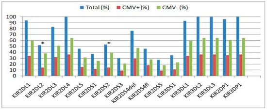 Frequency of CMV infection (CMV+) relative to each killer cell immunoglobulin-like receptor gene. The asterisk (*) indicates statistical significance.