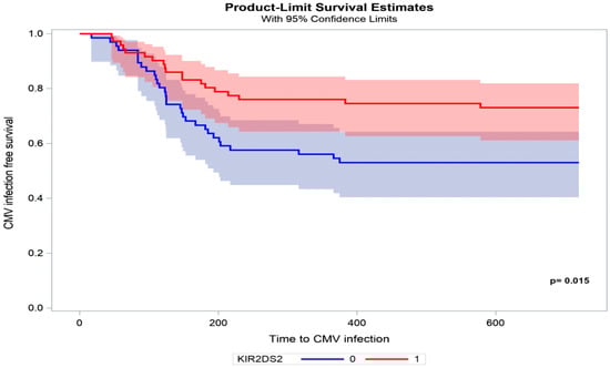 A Kaplan Meier curve of the time to CMV infection in recipients with KIR2DS2 vs. recipients without KIR2DS2 is shown in Figure 3.