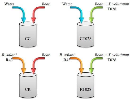 Scheme of the treatments performed in this work: CC, water control plants without fungal treatments; CT028, seeds coated with T. velutinum grown in uninfected soil; CR, untreated seed grown in R. solani (R43)-infected soil; and RT028, seeds coated with T. velutinum (T028) grown in R. solani (R43)-infected soil.