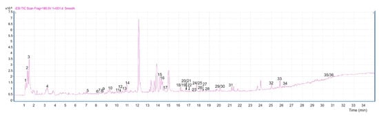 ESI-TIC chromatogram of leaf extracts obtained from control plants (CC), separated by LC-MS. See Table 1 for identification of the detected compounds.