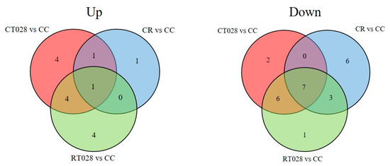 Several compounds were produced at significantly different levels in fungal-inoculated conditions compared to the control plants. The Venn diagrams reported in Figure 3 show the distribution of differential metabolites (UP or DOWN) accumulated in the plant metabolome during the interactions with Trichoderma alone (CT028), with the pathogen alone (CR) or with both fungi (RT028), compared to control, water-treated, plants (CC). Interestingly, some compounds were up- or down-produced in all the interactions examined (1 and 7, respectively, for UP and DOWN metabolites) but most of the differentially produced metabolites were found to be specifically influenced by the presence of one or both fungi.