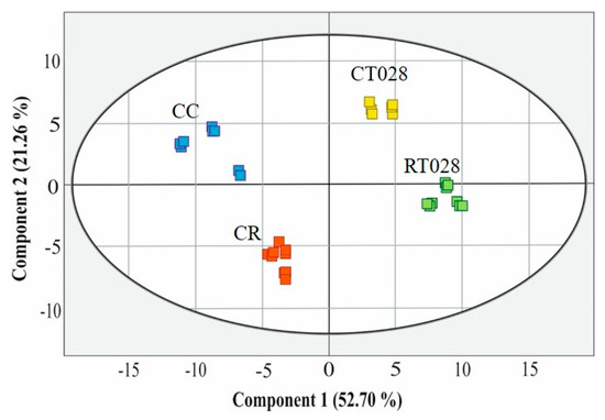 PCA was used to determine the relationship between the experimental treatments and the accumulation of selected phytochemical compounds in bean leaf metabolome. As shown in Figure 4, the first two components accounted for 73.96% of the total variance. Each metabolomic interaction was clustered separately. In particular, the plants infected with R. solani (CR) lie much closer to the control plants (CC), while the presence of Trichoderma, both alone (CT028) and together with the pathogen (RT028), also form a loose cluster (Figure 4).