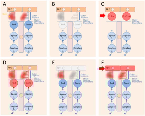 Retinal degenerations are defined by two distinct genetic entities. Inherited retinal degenerations are a monogenic but genetically heterogeneous group of diseases caused by inherited or de novo mutations, found in over 260 disease genes identified so far []. Age-related macular degeneration (AMD) is a late-onset multifactorial disease resulting from the interaction between multiple genetic susceptibility alleles and environmental factors []. The most frequent form of inherited retinal degeneration, retinitis pigmentosa, affects 2 million people worldwide []. Retinitis pigmentosa is characterized by a progression from night blindness due to rod photoreceptor death, followed by the dysfunction and degeneration of cones concentrated in the fovea at the center of the retina, leading to a broad therapeutic strategy applicable to many retinal degenerations []. Optogenetic strategies have also been evaluated for vision restoration. Originally, an adeno-associated virus (AAV) was used to deliver in the eye a microbial opsin, channelrhodopsin-2 from Chlamydomonas reinhardtii, which was followed by successful attempts using other microbial opsins as well as human rhodopsin in order to better adapt the excitation spectra of optogenetic tools to human vision rescue and to ameliorate the transgene expression [,,,]. Albeit independent of cell transplantation, optogenetics strategies share the same aim as photoreceptor transplantation—to restore the photosensitivity of blind retinas []. Cell replacement could theoretically restore vision in advanced stages of disease with severe cell loss.