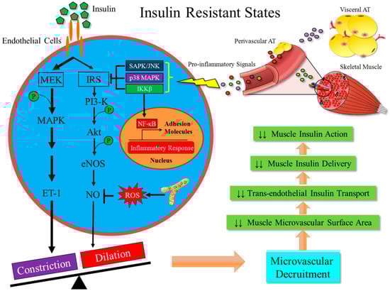 Diabetes prevalence continues to increase at an alarming rate and has become the most common and costly chronic disease worldwide. This pandemic currently affects over 400 million individuals, largely due to a rapid increase in the prevalence of type 2 diabetes mellitus (T2DM) []. Although the exact mechanisms underpinning the pathogenesis of T2DM remain to be elucidated, the disease is characterized by insulin resistance in multiple organs and systems. Insulin resistance is a complex metabolic abnormality that affects the ability of peripheral tissues to respond to insulin, leading to impaired peripheral tissue glucose utilization and resulting in the development of compensatory hyperinsulinemia and eventually hyperglycemia [,]. T2DM confers significant morbidity and mortality to patients by accelerating the development of atherosclerotic complications such as coronary artery disease, cerebrovascular disease and peripheral artery disease and predisposing patients to microvascular complications including retinopathy, nephropathy, and neuropathy [,]. Mounting evidence has confirmed that insulin, in addition to stimulating tissue glucose uptake and use [], is also a vascular hormone that regulates vascular tone and tissue perfusion []. In healthy humans, insulin acts on all segments of the arterial tree, induces endothelium-dependent vasorelaxation and increases tissue perfusion []. Insulin’s actions in the muscle microvasculature has garnered much attention in the past decade as it is in the muscle microvasculature that the exchanges of nutrients, oxygen, and hormones such as insulin between the plasma compartment and muscle interstitium take place and we and others have convincingly demonstrated that insulin resistance in the muscle microvasculature closely couples with impaired insulin-stimulated glucose use in muscle [,,]. Furthermore, endothelial dysfunction, characterized by abnormal vascular reactivity, increased production of reactive oxygen species (ROS), decreased nitric oxide (NO) bioavailability, and altered barrier function, is increasingly recognized as an early defect that leads to impaired vascular insulin responses and a contributing factor to the pathogenesis of T2DM and its cardiovascular complications [,,]. In this review, we discuss available evidence on the regulation of insulin actions in muscle microvasculature in health and T2DM and the potential role of microvascular inflammation in the development of endothelial and metabolic insulin resistance in muscle.