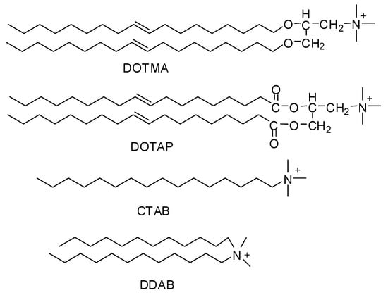 Since the middle 1980s, synthetically-prepared, positively-charged cationic lipids were considered effective delivery vehicles for proteins and nucleic acids. Before this, they were used for purposes like membrane fusion mechanisms and protein studies [,]. Felgner and his coworkers in 1987 were the first to use cationic lipid (DOTMA) as a gene transfer vehicle []. Cationic lipids such as DOTMA (N-[1-(2,3-dioleyloxy)propyl]-N,N,N-trimethylammonium chloride), DOTAP(1,2-dioleoyl-3-trimethylammoniumpropane), DDAB (Didodecyldimethylammonium bromide), CTAB (Cetyltrimethylammonium bromide) (Figure 1) are considered to be the most appointed and well-studied non-viral vectors. Being positively charged they bond and self-assemble easily with negatively-charged nucleic acids making complexes called lipoplexes. They also bind to negatively charged cell membranes more readily than conventional liposomes [].