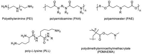 In 1995, Boussif and his colleagues [] were the first to use a cationic polymer called polyethylenimine (PEI) as a gene delivery vehicle. Now a great variety of cationic polymers have been synthesized and analyzed for their gene transfer ability. Cationic polymers may be either natural or synthetically developed. Natural cationic polymers include chitosan, cationic dextran, gelatin, cationic cellulose, and cationic cyclodextrin, while polyethylenimine (PEI), polyamidoamine (PAA), polyaminoester (PAE), poly-L-lysine (PLL), and poly dimethylaminoethylmethacrylate (PDMAEMA) (Figure 2) are the well-known synthetic cationic polymers []. Natural cationic polymers are generally non-toxic, less immunogenic, and biodegradable. Therefore, many of them like gelatin and cationic dextran have been approved by the FDA as safe biomaterials []. Synthetic polymers have the advantage of modification according to the situation by incorporating bioactive moieties and functional groups.