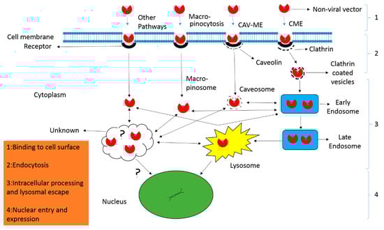 Endocytosis is the process through which biomolecules and other cargo enter into the cells. Generally, it can be divided into two categories, i.e., phagocytosis and pinocytosis. Phagocytosis refers to engulfing large solid particles while pinocytosis for taking up solutes, fluid, and smaller particles. Unlike phagocytosis, pinocytosis generally occurs in all types of cells, and therefore its related pathways are of prime importance in delivery. The most prominent pinocytosis pathways include clathrin-mediated endocytosis, caveolin-mediated endocytosis, clathrin- and caveolin-independent endocytosis and macropinocytosis [] (Figure 3). All of these pathways engulf the biomolecules and other cargos like non-viral vectors, and thus form various sizes of vesicles that eventually integrate into endosome. However, each pathway may deal the internalized vectors in different ways [].