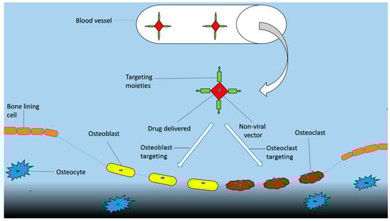Currently, a number of targeted delivery systems against bone disorders are available or are under consideration. Drugs can be delivered either by targeting the whole skeletal system or specific cellular locations in it. The pathogenesis of some diseases, including metabolic skeletal dysplasia, have been treated by targeting the entire skeletal system. However, specific targeting involves the delivery to the bone resorption cells, i.e., osteoclasts or osteoblasts; or bone formation cells, which is the focus of modern research []. In order to develop effective drug delivery, it is always important to select the most reliable targeting moiety. In the last few years a number of targeting moieties such as tetracycline and bisphosphonates (BPs) have been synthesized. Bone marrow cells have also been discovered to be used as a targeting moiety []. Moreover, nanoparticles like lipid nanoparticles (LNPs), liposomes, and Poly (lactic-co-glycolic acid) (PLGA) nanoparticles are also used as drug carriers. The US Food and Drug Administration (FDA) has also approved some nanoparticles which can be used as drug carriers in the treatment of skeletal disorders []. Apart from this, some viral vectors like lentiviral vectors, adenovirus vectors, adeno-associated virus vectors (AAVs) and retroviral vectors are also used as bone-targeting RNA delivery systems.