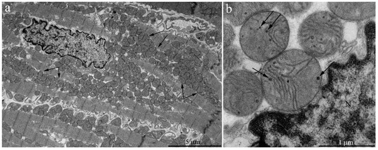Electron microscopic images of the ultrastructure of a left ventricular cardiomyocyte from a 6-month-old naked mole rat: (a) General view photo at low magnification. Long rows of mitochondria along myofibrils are visible. Arrows show mitochondria located within a sarcomere. (b) Ultrastructure of a single mitochondrion at higher magnification. Arrows show the electron-dense granules in the matrix. N—cardiomyocyte nucleus.