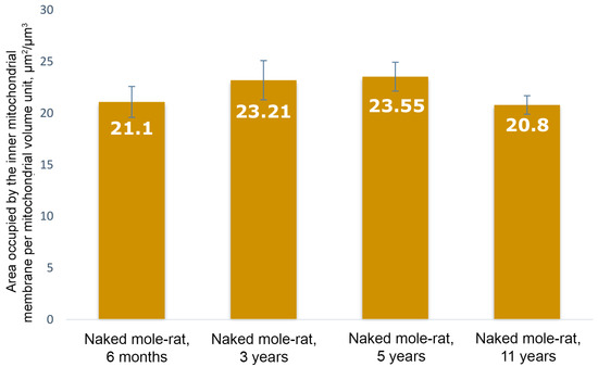 Results of morphometric analysis of cardiomyocyte mitochondria ultrastructure in naked mole rats. The area of inner membrane per mitochondrial volume unit in naked mole rats aged 6 months, 3 years, 5 years, and 11 years.