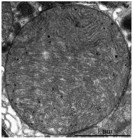 Figure 6b shows a fragment of cardiomyocyte from the left ventricle of a naked mole rat aged 11 years. Similar to cardiomyocytes of five-year-old naked mole rats, the perinuclear area contains only a single large mitochondria with unusual ultrastructure. However, mitochondrial ultrastructure is partially impaired in this population, both in perinuclear and inter-fibrillary mitochondria. Figure 7 shows the ultrastructure of a mitochondrion, indicated by the arrow in Figure 6b. It is seen that the elements of ultrastructure organization typical for this mitochondrial population are preserved only in the peripheral area of the organelle. The middle area of the mitochondrion contains tightly packed and folded membranes, where matrix and intermembrane space are hard to distinguish. This local degradation of mitochondrial ultrastructure was observed in megamitochondria of cardiomyocytes in the biopsy from a 58-year-old human male [11].