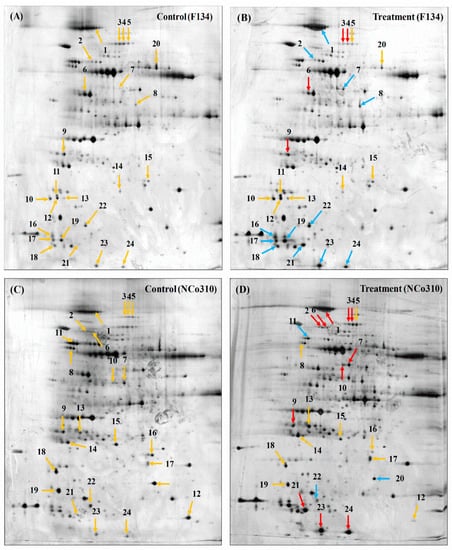 2-DE SDS-PAGE gel pictures of sugarcane varieties F134 and NCo310 with their controls. (A) control (F134), (B) treatment (F134), (C) control (NCo310), and (D) treatment (NCo310). Yellow for the protein spots of interest, red for upregulated proteins, and blue for downregulated proteins.
