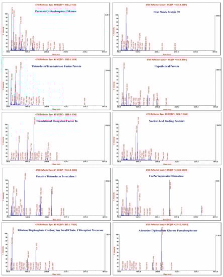 Peptide mass fingerprinting and tandem mass spectra of thirty proteins were achieved (Figure 2). Thirteen and twelve proteins had known functions and the sequence similarity was known to those proteins in both varieties. Based on bioinformatics analysis these proteins were found to be related to molecular processes, cellular components and categorized into numerous functional groups, i.e., peroxidase activity, DNA binding, metabolic processes, defense and stress responses, photorespiration, protein refolding, chloroplast thylakoid membrane, nucleus, plasma membrane, chloroplast, and proton-transporting ATP synthase complex (Table S1).