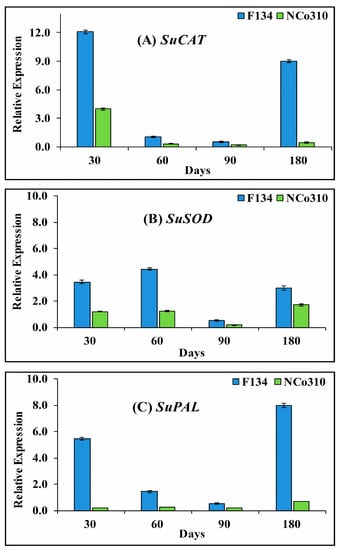 The RT-qPCR method was used to compare the expression of antioxidant enzymes (CAT, SOD, and PAL) at different developmental stages in both sugarcane varieties after smut pathogen interaction. The expression of all these enzymes was constantly elevated in F134 than NCo310, showing a positive response against disease resistance. In previous reports, PAL, which catalyzes an important step in the phenylpropanoid pathway, participated in sugarcane resistance to smut [,] and also played a role in resistance to chilling, drought, and salt stresses in sugarcane []. The activity of catalase, an iron porphyrin enzyme, was always higher in a smut resistant sugarcane variety than a susceptible variety, which protected sugarcane against reactive oxygen-related stimuli []. The expression of three different maize catalase genes was regulated differentially in response to fungal toxin []. Jain et al. [] reported higher activity of SOD protects cells against ROS in water deficit conditions.