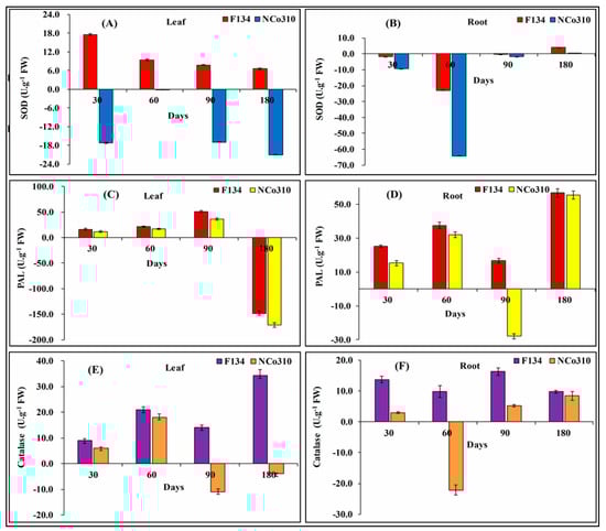The activities of antioxidant enzymes SOD, PAL and CAT, and hormone contents were calculated for different time intervals (30–180 days) in both F134 and NCo310 following smut infection. Both leaf and root tissues were separately tested to measure the enzyme activities (Figure 4).