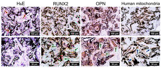 Graphene scaffold induce osteogenic differentiation in vivo. MSCs were seeded onto graphene scaffolds and transplanted into subcutaneous pockets of SCID mice. After four weeks, there was the formation of bony-like structures on the surface of the graphene scaffold (H&E, white arrows) that presented positive expression for the markers of osteogenic differentiation Runt-related transcription factor 2 (RUNX2) and osteopontin (OPN) (green arrows). The positive staining for specific for human mitochondria confirmed that the tissues formed were populated by human cells (blue arrows).