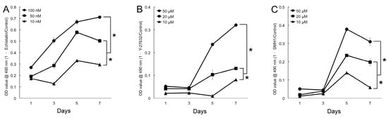Effects of mechanotransduction inhibitors on cell proliferation. All inhibitors concentrations decreased cell proliferation at all time points compared to controls. After seven days, the proliferation decreased by approximately 30%, when cells were treated with 10 nM of echistatin (A) and 50 µM of Y27632 and DMH1 (B,C) comparing to the untreated control. (* denotes statistical difference between the groups, p < 0.05. For the sake of clarity, only the statistical significances at day seven are depicted).