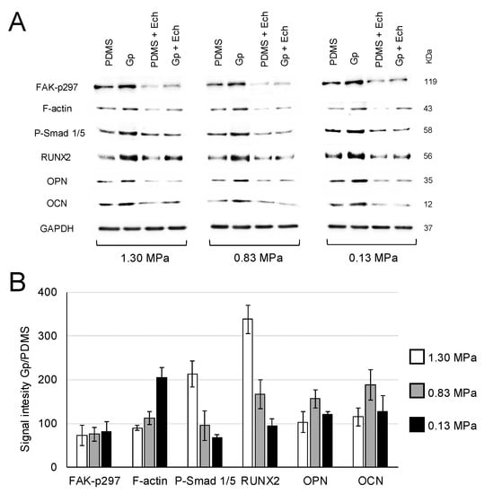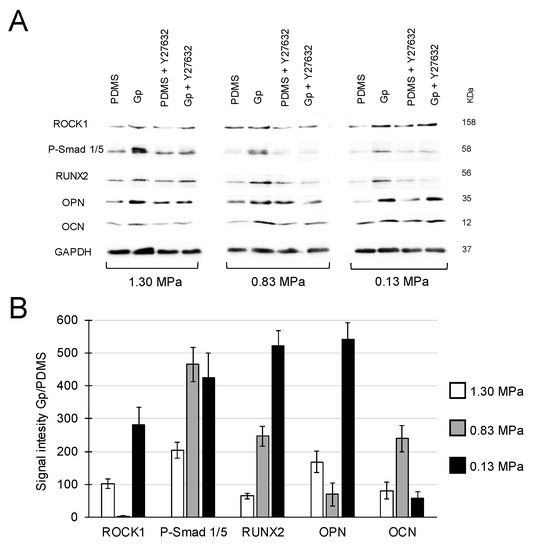 (A) Regardless of the stiffness of the underlying substrate (PDMS), Gp upregulated the expression levels of ROCK1, Smad p1/5 and F-actin and bone-related proteins. With the exception of ROCK1/0.83 MPa, Gp increased the expression of all proteins by >50%. (B) Relative quantification of all groups in the absence of inhibitors. Signal intensity is in arbitrary units.