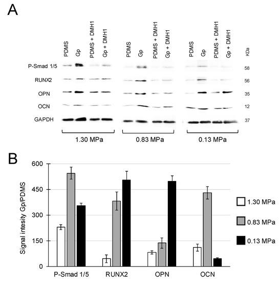 (A) MSCs grown on Gp exhibited greater increases of Smad p1/5 and of the classical markers for osteogenic differentiation, RUNX2, OPN and OCN. The expressions of p-SMAD increased by >180% on Gp compared to PDMS alone. The treatment 50 µM of DMHI decreased the expression of all protein studies. (B) Relative quantification of all groups in the absence of inhibitors. Signal intensity is in arbitrary units.