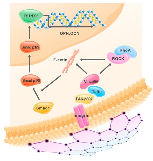 Stem cell lineage commitment is modulated by the elastic characteristics of their microenvironments [21]. For instance, MSCs cultured in a rigid hydrogel (G’ = 3600 Pa) exhibited higher mineralization potential than those cultured in hydrogels with elastic modulus of G’ ≤ 1570 Pa [22]. Similarly, stem cells from human exfoliated deciduous teeth (SHED) exhibit greater potential for osteogenic differentiation with increasing substrate rigidity [23]. Substrate matrix stiffness influences osteogenic differentiation of MSC via mechanosensing pathways conveyed through α-integrins, Rho-associated protein kinase (ROCK) and focal adhesion kinase (FAK) [24,25]. Indeed, an increase in the substrate stiffness enhances osteoblastic differentiation through the α2-integrin-ROCK-FAK-ERK1/2 axis [26]. As graphene has a very high elastic modulus (>1.0 TPa [27]), high in-plane stiffness [3] and remarkable flexibility for out-of-plane deformation [8], it is reasonable to assume that the osteogenic differentiation promoted by this material is similarly triggered and mediated by the activation of the mechanotransduction integrin-FAK axis. Unveiling the intracellular cascade(s) evoked by graphene and governing osteogenic differentiation is thus critical for the effective clinical translation of this carbonaceous and versatile material.