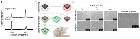 (A) Raman characterization. The Raman fingerprints confirmed the successful production of single layer graphene films and multilayer graphene scaffolds. (B) Graphene scaffold transplantation in vivo. MSC were seeded in the chemical vapor deposition (CVD)-grown graphene scaffolds (10 × 10 × 1 mm) and maintained in suspension plates at 37 °C for seven days to allow for attachment and proliferation. The scaffolds were placed in three-dimensionally (3D)-printed polylactide protection containers and implanted subcutaneously into immunodeficient mice for four weeks. (C) Cell attachment on PDMS with tunable elastic properties and graphene. Cells attached and proliferated on the surface of the oxygen plasma-etched PDMS substrates and single layer CVD-grown graphene.
