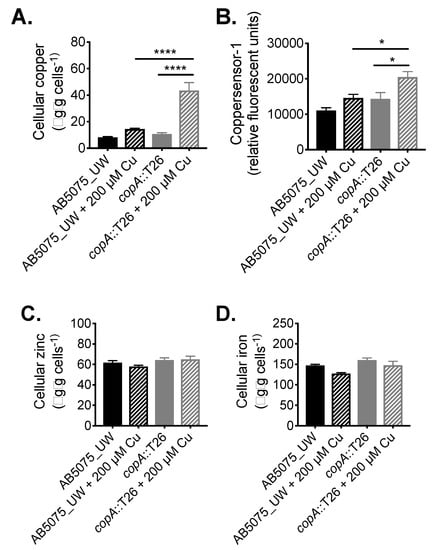 - Hassan, K.A.; Pederick, V.G.; Elbourne, L.D.; Paulsen, I.T.; Paton, J.C.; McDevitt, C.A.; Eijkelkamp, B.A. Zinc stress induces copper depletion in Acinetobacter baumannii. BMC Microbiol. 2017, 17, 59. [Google Scholar] [CrossRef]