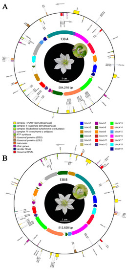 Mitochondrial genome maps of sterile line 138A and maintainer line 138B. (A) Mitochondrial genome map of 138A. (B) mitochondrial genome map of 138B. Genes with the names inside the circle are transcribed clockwise. Genes with names outside the circle are transcribed counterclockwise. The colors of the genes denote the functions of the gene products. Syntenic sequence blocks between genomes are depicted on the inner circles to separate blocks in different directions. In the center of the maps are the sterile flower of 138A and the normal fertile flower of 138B, respectively.