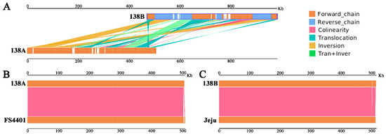 Mitochondrial genome syntenic sequence analysis. (A) Syntenic sequence analysis of 138A and 138B; (B) syntenic sequence analysis of 138A and FS4401; (C) syntenic sequence analysis of 138B and Jeju. The upper and lower bars in each figure represented the mitochondrial genomes. Dark-orange and blue regions in each bar represented the forward and reverse direction of the aligned genome, respectively. White regions in each bar represent the sequences that could not be aligned to the other genome. Lines between the two bars indicated the syntenic types and locations: magenta, blue-green, dark yellow, and light-green represent for collinear, translocation, inversion, and tran + inver, respectively.