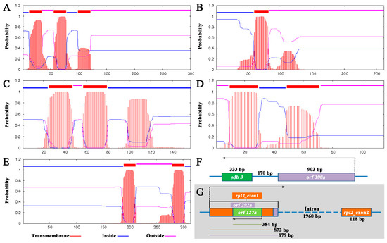 Chimeric structures, co-transcribe event, and transmembrane domain of the specific ORFs in 138A. (A–E): Locations and probabilities of the transmembrane domains of the gene products of orf300a (A); orf262a (B); orf157a (C); orf115b (D); and orf314a (E). (F) Co-transcribe structure of orf300a and sdh3; (G) chimeric structure of orf292a and rpl2-exon1, a long horizontal arrow shows orientation of transcription.