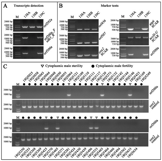 Results of PCR amplification. (A) Transcript detection of orf292a, co-transcript detection of orf300a-sdh3, transcript detection of orf300a; (B) CMS makers (orf456, orf507, cox2 SCAR, atp6 SCAR, accD-U SCAR, orf300a) test in 138A, 138B, 139C. (C) CMS maker orf300a tests in 43 pepper inbred lines, cox2 positive control.