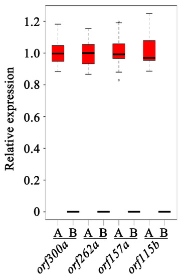 It is known that most CMS and CMS candidate genes feature chimeric structures and/or co-transcribing with functional genes. Thus, chimeric structures and co-transcripts were analyzed with the 138A specific ORFs. To the chimeric structure, only one chimeric structure was predicted. This chimeric structure was found in orf292a, which contained whole rpl2 exon1 and a 7 bp sequence of unknown origin at the 3′ end (Figure 4G). Rpl2 encodes a ribosomal protein large subunit. The existence of the orf292a transcript was confirmed by RT-PCR and sequencing (Figure 5A). Another co-transcript event was only confirmed in orf300a and the nearby gene sdh3. This transcript consisted of the full length of orf300a and sdh3 as well as the 171 bp intergenic sequence (Figure 4F). The co-transcript was also confirmed by RT-PCR (primers: orf300a_F/sdh3_R) and sequencing (Figure 5A). As transmembrane domain is another characteristic of the CMS genes, we performed structural analysis of 138A specific novel ORFs. The following five ORFs (orf157a, orf314a, orf262a, orf300a, and orf115b) were examined for the presence of transmembrane domains (Supplementary Materials Table S2, Figure 4A–E). Also, the expression patterns of four candidate genes, including orf157a, orf262a, orf300a, and orf115b, were also analyzed in anthers of 138A and 138B using real-time PCR (Figure 6). Results showed that almost none of those four genes were expressed in 138B, suggesting those genes expressed at very low level in the maintainer line (Figure 6).