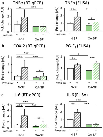 Impact of static compressive force application on the expression of proinflammatory genes. Gene expression and protein secretion of (a) TNF-α, (b) COX-2/PG-E2 and (c) IL-6 of N-SF and OA-SF after 48 h with or without static compressive force application. AU: arbitrary units; RT-qPCR: n = 9; ELISA: n = 6. * p ≤ 0.05, ** p ≤ 0.01, *** p ≤0.001. Statistics: Welch-corrected ANOVA with Games-Howell post-hoc-tests.