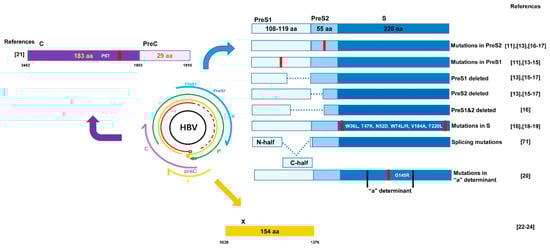 Bock et al. (1999) [15] examined three naturally occurring mutations in the preS region, MUT1 (a point mutation in the CCAAT box), MUT2 (a 6 bp deletion 38 of the CCAAT box), and MUT3 (a 153 bp deletion in the preS2 region). They found the accumulation of the mutant S proteins in the ER. MUT1 and MUT2, or a combination of MUT1 and others, showed significantly decreased extracellular S protein (60–75% reduction) compared with that of the WT; while MUT3 was related to abnormalities in viral particles. Collectively, preS mutations affect S gene modulation and lead to the development of liver disease.