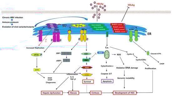 Many studies have consistently reported the relationship between preS mutants (LHBs and MHBs) and liver disease progression, and ER stress is considered to be a key core underlying mechanism for liver disease progression [63]. Both preS1 and preS2 mutants have defective capacity to secrete surface proteins, and this accumulation in the ER causes ground glass hepatocyte (GGH) formation, which is a histological symbol of chronic hepatitis B infection.