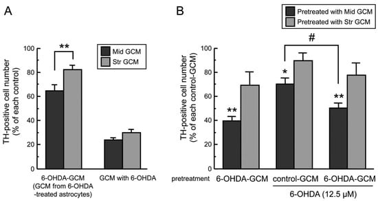 Glia conditioned media (GCM) from glial cells promotes the survival of neuronal cells [,,,] and astrocytes release GSH into culture medium []. Furthermore, astroglial neuroprotective effects in the co-culture system were different between mesencephalic astrocytes and striatal astrocytes (Figure 1). Such regional differences might be based on humoral factors secreted from astrocytes. Therefore, we examined neuroprotective effects of GCM from mesencephalic and striatal astrocytes against 6-OHDA-induced neurotoxicity in mesencephalic DA neurons. The viability of TH-positive midbrain neurons by 24-h incubation with GCM from 6-OHDA-treated astrocytes (6-OHDA-GCM) was higher compared to that incubated with control GCM plus 6-OHDA (100 µM) (Figure 2A, 6-OHDA-GCM vs. GCM with 6-OHDA). When the mesencephalic neuronal culture was incubated in GCM from mesencephalic astrocytes (Mid GCM) or striatal astrocytes (Str GCM) treated with 6-OHDA (100 µM) for 24 h, the GCM of 6-OHDA-treated striatal astrocytes showed a greater neuroprotective effect on the viability of TH-positive neurons than that from mesencephalic astrocytes (Figure 2A, 6-OHDA-GCM).