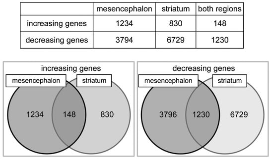 In order to clarify gene expression comprehensively, we conducted a cDNA microarray (SurePrint G3 Rat Gene Expression 8 × 60K; Agilent Technology), on which cDNA probes of 19,742 genes were blotted, and we detected increasing or decreasing mRNA expression in mesencephalic or striatal astrocytes by the 6-OHDA treatment (Figure 3). In mesencephalic astrocytes, 1234 mRNAs were increased, and 3794 genes decreased by the treatment of 6-OHDA (100 µM) for 24 h. In striatal astrocytes, expression of 830 mRNAs was increased, and that of 6729 genes decreased. Among these genes, expression of 148 mRNAs was up-regulated, whereas 1230 genes were down-regulated in both mesencephalic and striatal astrocytes after 24-h 6-OHDA treatment. Thus, the number of altered genes in both mesencephalic and striatal astrocytes was quite fewer than that we expected. There is a profound regional difference in gene expression in astrocytes induced by 6-OHDA.