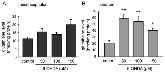 Total glutathione levels in astrocytes treated with 6-OHDA. Mesencephalic (A) or striatal (B) astrocytes were treated with 6-OHDA (50–150 µM) for 24 h. Each value is presented as mean ± SEM (n = 5–6); * p < 0.05, ** p < 0.01 vs. control group.