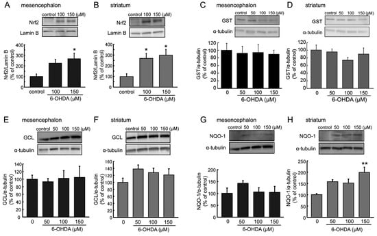 (A,B) Effects of 6-OHDA treatment (100–150 µM) for 6 h on nuclear Nrf2 expression in mesencephalic (A) or striatal (B) astrocytes. Data are means ± SEM (n = 5–6); * p < 0.05 vs. control group. (C–H) Expression of glutathione S-transferase (GST) (C,D), γ-glutamyl cysteine ligase (GCL) (E,F), and quinone oxidoreductase (NQO-1) (G,H) protein in mesencephalic (C,E,G) or striatal (D,F,H) astrocytes after the treatment with 6-OHDA (50–150 µM) for 24 h. Data are means ± SEM (n = 4–6). ** p < 0.01 vs. control group.