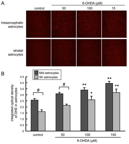 To study a possible regional difference in the induction of oxidative stress related to the neuroprotective effect of astrocytes, we examined production of ROS in mesencephalic or striatal astrocytes treated with 6-OHDA (Figure 6). Red fluorescence signal of superoxide indicator dihydroethidium (DHE) was significantly increased in both mesencephalic and striatal astrocytes by 6-OHDA (100, 150 µM) treatment in a dose-dependent manner. The DHE signal was much higher in mesencephalic astrocytes than that in striatal astrocytes at any of the doses of 6-OHDA examined (50, 100, 150 µM), even in the control group.
