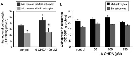 (A) Changes in quinoprotein formation in mesencephalic neurons co-cultured with mesencephalic or striatal astrocytes treated with 6-OHDA (100 µM) for 24 h. Each value is mean ± SEM (n = 4); * p < 0.05 vs. each control group, # p < 0.05 vs. midbrain neurons with midbrain astrocytes. (B) Effect of 6-OHDA treatment (50–150 µM) for 24 h on quinoprotein formation in mesencephalic or striatal astrocytes. Data are means ± SEM (n = 5–6).