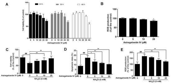 Wang, F.; Zhao, Y.; Chen, S.; Chen, L.; Sun, L.; Cao, M.; Li, C.; Zhou, X. Astragaloside IV Alleviates Ammonia-Induced Apoptosis and Oxidative Stress in Bovine Mammary Epithelial Cells. Int. J. Mol. Sci. 2019, 20, 600. https://doi.org/10.3390/ijms20030600