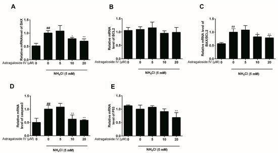 2.2. Effects of Astragaloside IV on mRNA Expressions of Apoptosis-Related Genes Induced by Ammonia in Bovine Mammary Epithelial Cells