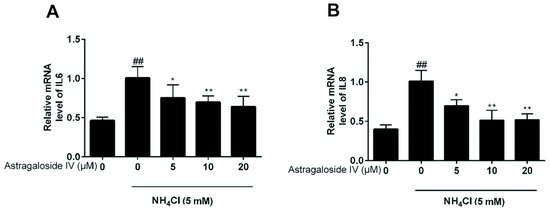 2.4. Effects of Astragaloside IV on mRNA Expression of Inflammatory Factors (IL-6 and IL-8) Induced by Ammonia in Bovine Mammary Epithelial Cells